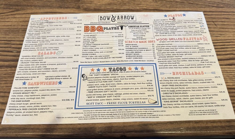 “ We ate and drank here after my niece's graduation at Auburn and were so impressed. Bow & Arrow combines two of our favorite BBQ and Tex-Mex cuisines. We weren't going anywhere else for dinner once we saw we could have queso and smoked meats. The decor is cute. They have string lights outside on their patio area. Pick between high tops or regular tables in the original building or the additional indoor patio area. It was busy when we walked in, so we went to the bar and sat immediately. Our bartenders were very friendly and helpful. I freaked out when I saw there was a margarita that was topped with Prosecco. It's called the TE-KILL-YA, but I wanted spicy, so she used a jalapeño tequila to make it spicy for me. It was great. If I ever come back, I would get it without simple syrup to make it less sweet. I liked it so much I got two of them. The first round for my hubby was the highwaymen. He loves mezcal and likes the drink, but it was a petite pour; for real, it filled only a 1/3 of the glass. He rarely drinks faster than me and finishes it in about four sips. His next drink was a mezcal, and he enjoyed it. We snacked on the Three Amigas so I could have queso and guacamole, and my hubby could have his salsa with them. Their chips are the outstanding, thin, crispy ones. The guy next to us was a former employee, and his favorite app was the cool ranch tater tots, so he was eating those. Deciding between BBQ and Tex-Mex was hard, so I chose the fajita grilled salmon Plato. It was delicious! The salmon was grilled to perfection. I loved the toppings of pickled onions and avocado with the bed of cheesy grits. The mix of the grilled poblanos peppers and onions gives the grits the Tex-Mex spicy flavor. My hubby enjoyed the mix-and-match taco plate. He picked the pork and fried chicken. He wanted the pork, and we both enjoyed the fried chicken. The fried chicken taco is one of the best we have devoured. Your tacos come with any side, so we picked the mac and cheese made from scratch, and it was so cheesy and good. We enjoyed our meal and will return if ever in the area again. ”